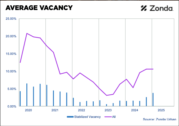 • Rental vacancies are rising, with downward pressure on asking rents